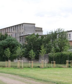 Des portraits en pied et en situation, choix de l’artiste ou choix du modèle ? On pensera au studio de l’un de ces photographes d’hier chez qui l’on venaient immortaliser son passage sur terre et se mettre en scène en prenant la pause. Certains de ces portraits ont traversé l’histoire, on les regarde avec nostalgie mais aussi pour la profondeur du regard qu’ils portent sur une époque révolue. Les grandes toiles exposées à l’Espace Vallès ont à la fois cette familiarité et cette force. On reconnaît un inconnu, quelque chose d’une humanité qui nous appartient. Mais cette proximité évidente est bientôt contredite. Les yeux explorent la toile, se tournent vers les visages, échouent à rencontrer les regards. Ces hommes sont absents. Les tableaux échappent ; ils exigent une autre approche. L’impossibilité à saisir les regards est la première indication d’un décalage de ce que l’on voit avec ce qui est. Le regardeur réalise à quel point ces images sont singulières, elles occupent un autre espace que le sien. Le réalisme de la peinture est démenti par celui de la posture. Des indices qui intriguent : cube en suspension, galbe de bâtons et capuche renversée, autruche, maquette d’étude… les significations se déplacent.